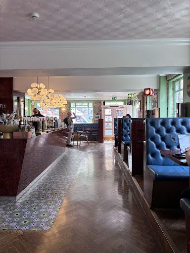 This is a good size pub that has the main bar on the ground floor and an additional room downstairs called The Den. The main bar has a contemporary feel and is decorated in vibrant colours. The servery is located on the right hand side as is illuminated by some amazing original 1950’s lights that hail from the Czech Republic. The seating is a mix of cosy booths, long banquettes and traditional chairs around stylish gloss wood tables. The Den in the basement is a cosy affair with similar styling as the main bar.