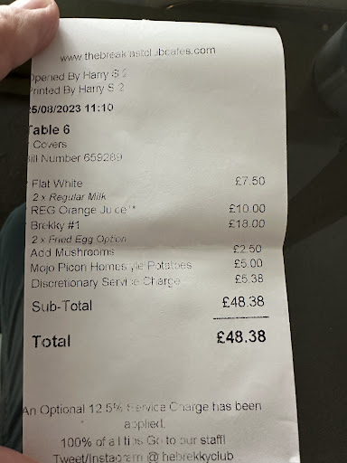 I ordered the breakfast as did my guest and we ordered the Home style potatoes to share. Breakfast was fine if nothing special, but the potatoes arrived in a sriracha sauce which I didn't mind so much, but they were cold, very overcooked and soggy. Far from the menu description. I drew the waiter's attention to it and he took them away and spoke to the hostess who said something to him and he returned with them and said that they were meant to be like that. I didn't want to make a fuss so I accepted that. I took another bite and they were fully cold and nasty so I left them. When he came to clear the table I said - 'Thanks, but I haven't eaten this as they were awful.’ I asked for the bill. Then came the second issue. The bill came and he brought the card machine at the same time. I saw the total on the bill (the potatoes had NOT been removed) and the card machine was presented to me with a screen that showed a menu for how much tip I wanted to leave. As I had NOT been impressed, I selected 10% and paid. £53 for TWO people with one coffee and one juice each was very steep. Only then, having paid I checked the bill in detail only to see that there was a service charge of £5.38 already applied. That infuriated me. As I waited for my friend to return from the bathroom I asked the waiter about the potatoes and he said that they had changed the menu and the Sriracha sauce was now coming on the potatoes. I said that I should have been told that when I ordered them, but either way, they shouldn't have been left on the bill when they were clearly poor standard. He spoke to the hostess again, and she dismissed him. Then while she was showing another group to their table we stood to leave and she had to brush past me to get to the other table, I said goodbye and she completely disregarded me. No goodbye, no sorry you didn't enjoy that ...nothing! Just looked through me and ignored me.