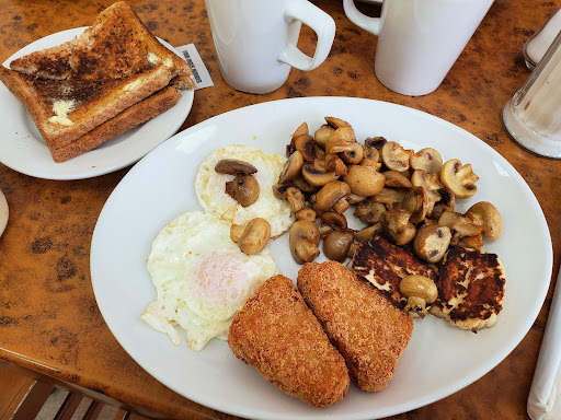 A classic Greasy Spoon cafe offering hearty full English breakfasts, Create your breakkie options, omelettes, brunch, lunch items, and pizza style dishes.
