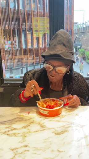 There aren’t any places to sit immediately next to this shop, but close by there are some dome things with tables inside where you need to be bold and just grab whatever available space there is. This turned out to be kind of fun too as we wound up dining alongside strangers that tried other options from market vendors. Overall, the environment at the market are super cool and hip. Not my scene really, but I felt comfortable...