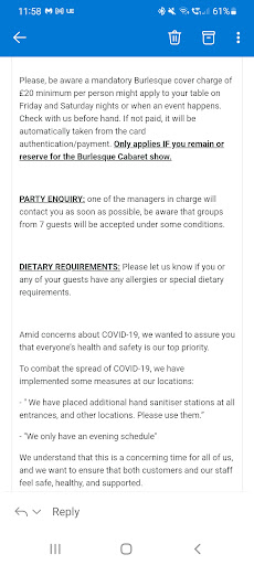 After rebooking that same day of the cancellation and accidentally requesting the table twice due to an error at my end in selecting 'dinner only' initially, I requested a second booking for the Burlesque show, emailing the venue, multiple times and asking them to please book us in for the burlesque table, apologising for my delayed payment of the initial booking. I then received a payment link for the £20 per head deposit which in the terms and conditions of the email is bolded stating "only applies IF you remain or book for the burlesque show." Assuming (incorrectly) that this confirmed that we had our burlesque table booking, we arrived on the night and were told that we only had a dinner reservation and that all tables were charged the £20 burlesque charge and refunded if you didn't watch it (forgive me, this seems VERY misleading to make us pay for something we definitely were not able to have?).