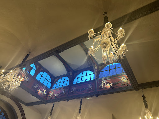 The space is stunning, featuring high ceilings, crystal chandeliers, ornate wall moldings, and artful botanical prints.