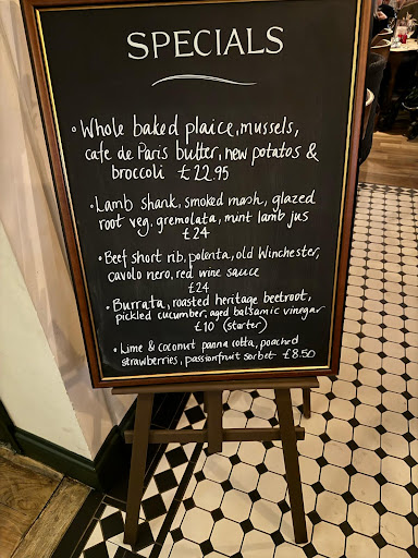 Ordered 3 of the plaice specials, squash carpaccio and brother ordered lamb shank. Waiter then said sorry we are out of lamb shank. OK no problem... picked something else. Chose the beef ribs.... again sorry also that has sold out. Both part of the specials menu so he choseĀ from the main menu... chicken Kiev. waiter said I'll go and check with the kitchen to see if available. We thought he was joking. Off he went to check. Came back, yes Kiev is definitely available. Amazing.