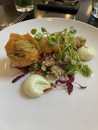 We ordered the beetroot mousse and the courgette flower for starters and we were sharing the aubergine schnitzel with a side of polenta chips and broccoli. The starter presentation was lovely and we were excited to try the food.