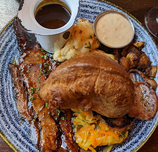 My wife tried the burger and gave me a bit to try and it was cooked very well with great flavours and encased in a nice brioche bun. My meal was unfortunately underwhelming and I instantly regretted ordering it. It mainly came with two slim cuts of the brisket with two half potatoes, a piece of cauliflower, some gravy, a horse radish type sauce with some mixed vegetables and a Yorkshire pudding placed in the middle. There were also a few other bits. It was a nice put together dish with nice complementing flavours but for what is effectively a £22.50 roast (with service charge), an extra potato wouldn't have gone amiss along with much thicker pieces of beef brisket.