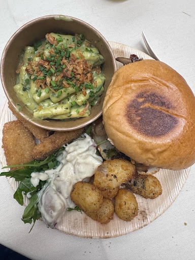 Once ready, the sceptics lined up alongside the veggies and vegans and received their tray of treats. Hogless bap, with stuffing, apple sauce and crackling, tater tots and coleslaw and some of the most delicious and oozy vegan mac 'n' cheese ever to grace this green earth.