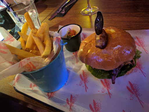 The place is small it was quite empty for a Friday when we went. The decore is nice but had no ambience. Smoking area is right next to the door when someone opened it all smoke comes in, it’s really not nice specially if you are a non smoker. The menu is quite common ( no steak unfortunately). We had to wait a lot for the drinks, but the milk shake was really tasty. We ordered starters, which we never received only when the main came out to the table we’ve been told no starter ( no reason why not it would of been nice to be told there won’t be any). The burgers were really nice, absolutely delicious. Unfortunately. We never had dessert menu or any table service really, so can’t say more about the food. We have not been offered any desert menu or any drinks or coffe so we just had to go to the staff to pay eventually. Yet service charge is added to the bill. The staff needs serious training at least on basic waitressing prior charging for service which is not there. The food maybe better of to be offered for take away then...