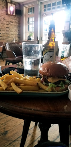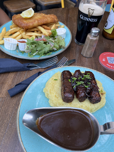 This place is such a gem! My fiancé and I felt like we got the real English pub experience. You order from a QR code and the bartenders will bring the food to you. We came on a Monday night around 7 pm and food was 50% off. They had a happy hour deal on drinks as well. We got a chicken apple salad, fish and chips, and bangers and mash for 20 pounds. Two draft beers (a Guinness and a pale ale) were 13 pounds. The bartenders also had great recommendations for beers and their tasting profile. What a steal! And the food was delicious too.