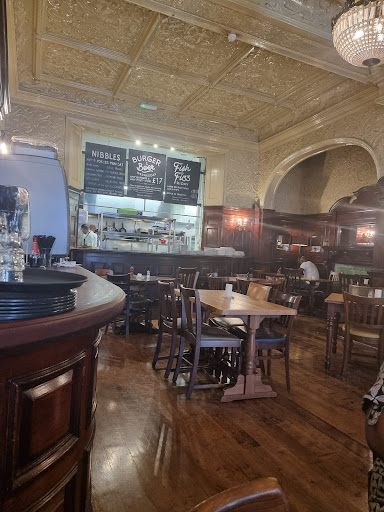 Once you walk through the impressive corner entrance you arrive into a magnificent bar that is full of original period features. At the centre of the bar is an ornate island servery with detailed wood panelling and a curved counter. The main bar area is divided into four sections with a dining area and an open kitchen at the rear. Everywhere you look around this palatial pub you’ll see beautiful Art Nouveau stained glass, attractive intricate plasterwork, and swathes of dark wood panelling.