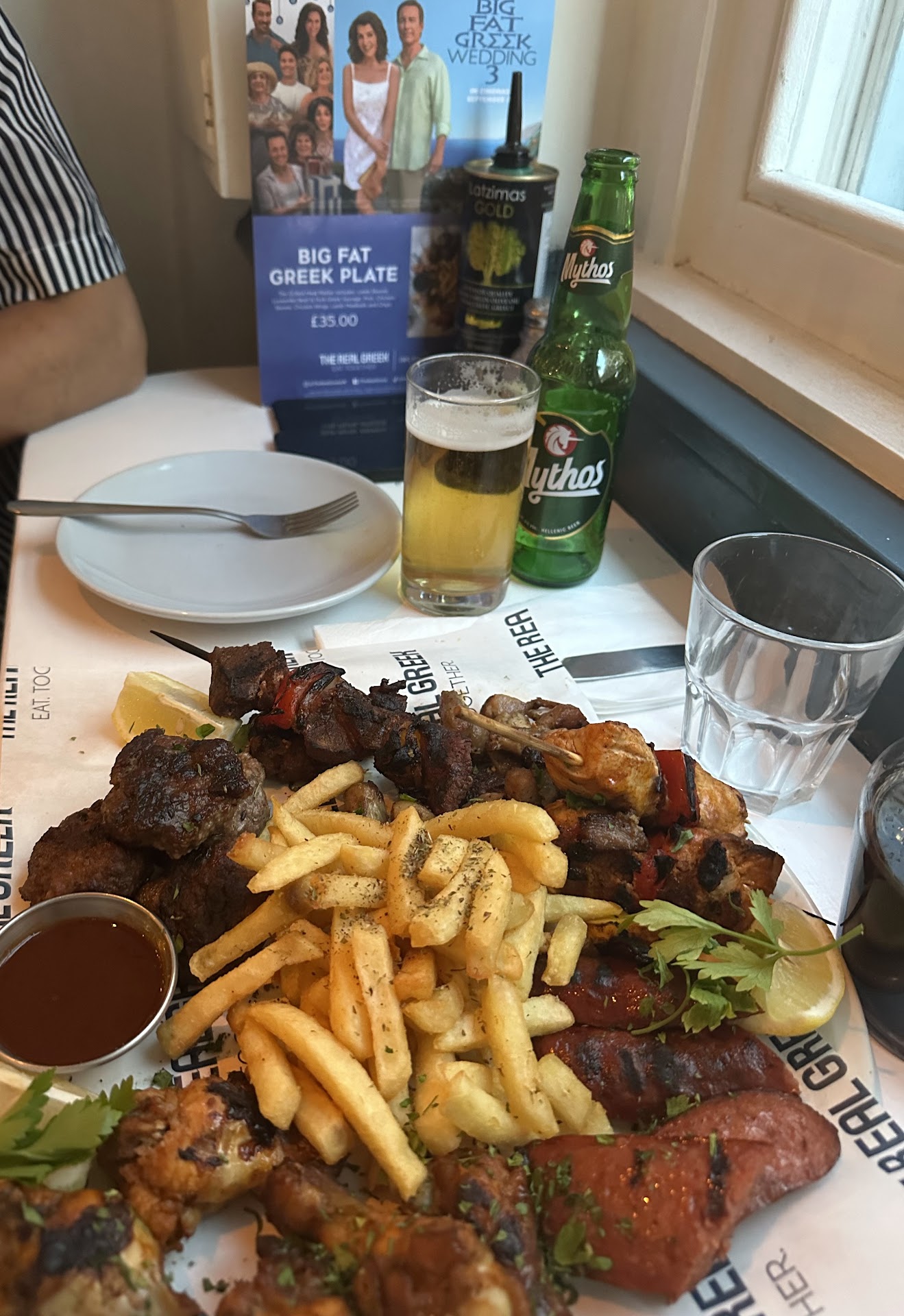 Ā Ā Ā Read moreWe booked for dinner in Covent Garden Real Greek to enjoy the Big Fat Greek Plate and we where totally disappointed š It was a small plate definitely not for 4 people , dry overcooked small peaceās of meet and a smal amount of overcooked oily chips ! Absolutely not a greek food! It was basics pub meal with chicken wings and meat cuts with bbq sauce for 2 people ! Definitely not a greek style plate ! Nothing like Greek food! The hostess was not present at the door , it was half empty restaurant on Sunday early evening and there was only 1 waitress , the manager was eating and obviously the service was not good ,there was no properly trained staff on service !! The atmosphere is not pleasant because they have keep the interior as it was the local pub before and only have painted everything blue & white and have stuck small tables in the middle which is not working. You feel on top of each other when sitting and the waitress have problem moving around with plates and trays because is very tiny space between tables and chairs. The very old Greek music at the background didnāt help to lift up the atmosphere and it didnāt feel anything like Greek restaurant!!! More like eating in a old pub ! We can not recommend this place or the food ! Is not good value for money ! It should not be named the Real Greek because there is nothing...