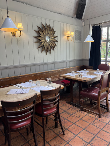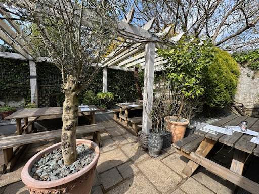 The outdoor seating area is simply idyllic. Surrounded by greenery and classic pub architecture, it’s the perfect spot for a sunny afternoon with friends or a cozy evening with a glass of wine. The rustic wooden tables and soft lighting give the space an inviting, relaxed vibe.
