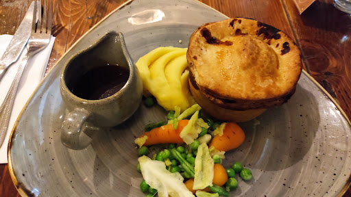 Being a Nicholson pub it has their range of beers (Nicholson's own) along with some good pies. I ordered a London lager and chicken & ham cheese pie, which arrived with mash and some veg. The pie contained some good chunks of chicken and ham hock in a cheese sauce (which clashed with the gravy, I found - but that was my fault for ordering that pie) surrounded in a crispy flaky filo pastry; a nice soft hot filling with crunchy outer, very well made. The veg was slightly underdone so still crunchy (hard carrots) which I found preferable to a soggy mess. Mustard - when requested - was Colmans! Definitely a foodie's place.
