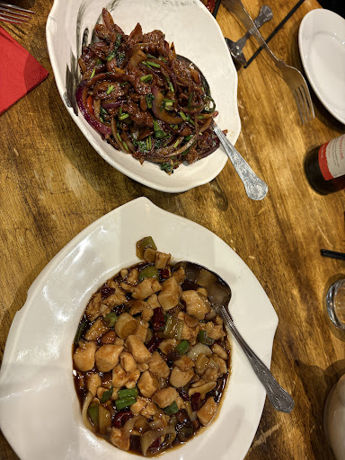 This is a great place for authentic Sichuan food conveniently located in the City. It is a smart looking place, with ornately carvd Chinese wooden furniture and red laterns. It's pretty enough to bring a date here, which is not the case for a lot of authentic Chinese restaurants. Wait staff is attentive. Portion sizes are a little smaller than, say, Chinatown. We were a group of 5 and ordered two baskets of steamed dim sum and 6 dishes and had room for dessert, afterwards. One of our number can't handle spicy food at all (I know, so crazy to be at a Sichuan restaurant) but it was quite easy to order carefully enough for her to enjoy everything. One of my favourite dishes they do here is stir fried lamb with cumin. Very tender and tasty. Marked with one chilli pepper, so categorized as mildly hot, but the member of our party who can't have spice loved it's slightly middle eastern flavour. Gong bao chicken was very tender, and slightly sweet. Despite also being marked with one pepper on the menu. The sprinkle of whole dried chilli's adds more scent than heat as long as you don't bite into one. The cold chicken and spring onion appetizer had a tangy dressing and pickled bamboo shoots. Cold and pickled dishes are a classic part of a Sichuan menu. Pan fried prawns with asparagus is not a Sichuan dish but it was good and contained large succulent peeled prawns with fresh green asparagus and green peppers. Cantonese beef hor fun is also not a Sichuan dish but quite impressive. This dish is a good test of kitchen skills in a Chinese restaurant. The version at the Sichuan had plenty of wok hei, which comprises my test. This is the smokey charred flavour imbued by wok contents catching fire while being tossed. You just can't impart this flavour at home using a domestic burner because the temperature required is too high. Despite passing the wok hei test, I thought the hor fun could have looked more attractive if it had included some green onion and some dark soy. Di san xian is a non spicy Sichuan vegetable dish of aubergine, green pepper and potato where ingredients are first deep fried separately, and then stir fried together with a sweet and savoury sauce. The execution of this dish has been uneven at the Sichuan in the past, but tonight it was excellent because the first stage of cooking was performed at high temperature. We also had two baskets of prawn dumplings which didn't arrive at the beginning of the meal. Actually all the dishes arrived in random order, regardless of whether they appeared in the mains or starters section of the menu. Normally, I would expect that 7 dishes for 5 people wouldn't leave room for dessert. However, we shared raspberry and yuzu souffles, which are not really Chinese desserts. The raspberry was our favourite. We also ordered two tang yuan soup (a sweet soup with glutinous rice flour dumplings filled with black sesame paste) and one order of sweet potato fritters. We actually got two orders of fritters and one soup. For my taste, the dessert soup itself (not the dumplings) could have been sweetened a little more. We questioned the waitress when the fritters first arrived because we thought the serving size was large for a single portion. We were also erroneously charged for tea for 6 people despite being a table of 5. So check your bill and orders here, as mix ups do occur. Bookings are recommended as the restaurant was pretty busy on a Monday...