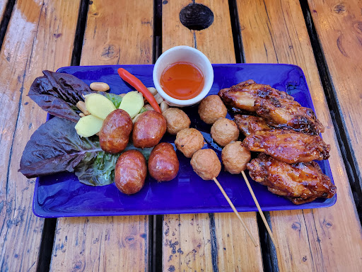 The food downstairs is good! The menu is Thai; our favorite dishes were the Panang + Massaman curries.