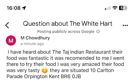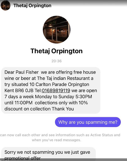 Read moreThis venue is wholly immoral! Not only do they spam people illegally. I have no connection with this venue but they spammed me an advert. When I posted the spam screenshot the owner sought to claim I was mistaken as it must be another restaurant. It had the venues name address and phone number in it NO MISTAKE! Also on trip advisor any restaurant they see as a competitor they post a âquestionâ that is simply an advert for theirs! I know these were them as the profile posting the spam questions uses the same profile to post management responses to trip advisor reviewsâŚ.BUSTED! Multiple âquestionsâ reported to trip advisor which they removed! The response seems to ignore the fact that THEY FIRST CONTACTED ME WITH SPAM. Also many of the spamming of other venues in their area were posted by someone who had a management role in responding to reviews on trip advisor thus there must be some culpability despite denials. I also live 25 miles from the venue with some brilliant venues nearby, why would I be interested in travelling to such a morally...