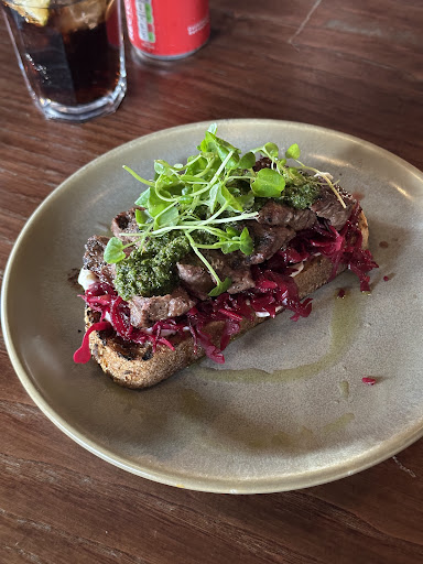 I had the steak open sandwich and it was delicious! I asked for medium rare, it was a bit overcooked. But the steak was very soft, tender, easy to bite and cut, and well seasoned. It went well with the red cabbage, a bit of horseradish sauce and a tasty piece of sour bread slice on the bottom. I did really wonder what is an open sandwich, when I saw it I thought of bruschetta haha Highly recommend this steak open sandwich!