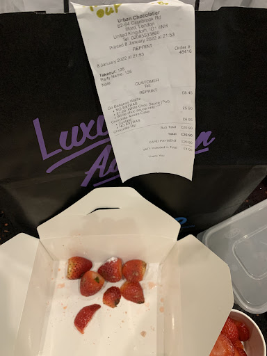 When my food eventually arrived I couldn’t see the strawberries noted on the receipt. So I asked the manager if the strawberries had been provided. He said he had not charged me for the strawberries and that there would be an additional charge of £1.50 for a tub of strawberries. I paid the money and drove home (I live about 3 miles away).