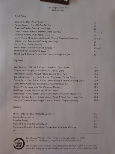 Read moreI met a friend here for Sunday lunch and we thoroughly enjoyed ourselves.Friendly and obliging staff. The woman bar tender made me the BEST Bloody Mary I have ever had (other than those I make myself). She also assured me I could have a small portion of the regular roast. We both opted for a roast and sure enough mine was roughly half the size of my friends down to half the enormous Yorkshire. It was delicious and beautifully cooked. Followed by a perfect Americano coffee. Most of the clientele were obviously regulars and that generated a pleasant atmosphere . No major matches on so we didn't have to cope with football on telly or indeed any television at all. I am glad I chose the Village Green for lunch - it is the pub closest to me so I will certainly visit again - the two for one deals caught my eye, maybe fish and chips on Friday? Thank you! lovely lunch, even...