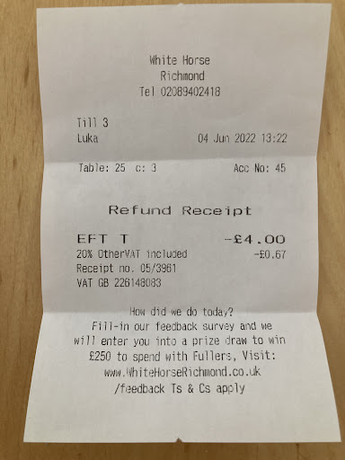 Read moreWe called in early November and had our booking accepted for Christmas Day. We specifically asked if any deposit, or anything else, was needed, to which we were told ‘No, just turn up’. To our own fault we should have realised that this was unusual, and followed up, but being busy we took the person on the end of the phone at their word, and accepted the booking as made. Today, we turned up for our Christmas dinner to be told there was book record of it, and that the pub does not take walk-ins on Christmas Day. We explained that we had made a booking, and were certainly not ‘Walk-ins’ but this initially fell on deaf ears, being told in a variety of different ways that it must be us that made the mistake, perhaps having spoken to a different ‘White Horse’, until we showed the phone number in he call history on the phone. Ultimately, what happened here is that we were told we had a booking which was not recorded. Today, the manager did accommodate us, however, as you will see from the photo, it was essentially scraps of meat and potato, and not what we expected from a Christmas dinner. The manager did, to his credit, discount the bill, somewhat, after we’d already paid for a bottle of wine and a couple of mixed drinks at bar prices, however, on reflection, it was a terrible experience. I’m starving, and have just ordered pizza on Christmas Day - something I’ve never done before and hope to never be in the position...