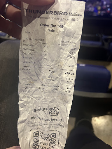 Ā Ā Ā Read moreThe reason there are so many high reviews is because theyāre mostly all fake: incentivised with Ā£20 raffles. As for the food⦠I wonāt be doing this to myself again. The menu is well designed in a nice Canva template but what you receive doesnāt match the promise. The chicken is salty and thatās about its only flavour profile. The chicken burger was in an un-toasted buns straight from the bag. How much lazier can one be? Even at home Iām only this lazy if Iāve got the flu and grabbing at bread for pure calories. I put my wager on the original investors going āletās do fried chickenā and then never conducting a taste menu, and going straight to mass production and marketing. No napkins, no condiments, no utensils; you must ask for them individually. The so called ākids mealsā are just as sad. When you go into the food business and care about your customers as much as an ex from high school⦠you get Thunderbird (ahem, more...