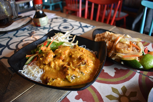 For our mains we had the BĂșn Ga: vermicelli, grilled chicken satay, beansprout salad & sweet chilli. We also opted for the Pad Thai Veggie: egg, chilli, assorted vegetables, tofu, lime & peanut. You can make this dish vegan by removing the eff. The BĂșn Ga was a bed of rice noodles topped with a chicken satay sauce with chunks of grilled chicken. It was flavoursome whilst not being too spicy sauce and rather moreish! The salad had mint running through it which was a tasty addition to the noodles. The Pad Thai was equally good - full of veggies with big chunks of flavour filled fried tofuâŠdelicious!