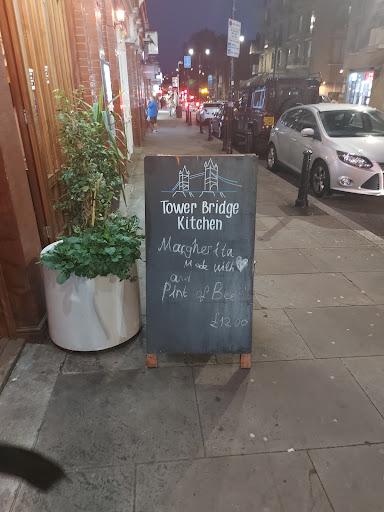 Read moreWe decided to try Tower Bridge Kitchen for our Dinner as it looked like a lovely homemade style pizza restaurant and they had an offer on the board outside for a margarita pizza and pint for £12 which sounded great for London centre. Unfortunately we were let down on service and the offer. There were only 3 other tables occupied however service was limited. I asked about the offer on the board and was told it was a lunch time deal, it didn't state this on the board and at 19.30pm was still being advertised. I suggested she should write that on it or bring the board in. she said 'she didn't know ' and shrugged off the suggestions. Disappointed ,we ordered anyway. There was only 1 choice of draught beer, Cobra(incase anyone fancies the LUNCH deal) we received our pizzas approximately 30 minutes later and they were lovely, good sizes and very tasty. We did have to flag the waitress down to order more drinks and the table next to us had to flag her down for parmigiano for their pasta as they hadn't been offered any. No one offered us any pepper or parmigiano either or came back to check everything was OK. When receiving the bill a service charge of 12% was already added. Due to feeling like we really hadn't received great service we asked if it could be changed to our own choice of tip and we were told it was company policy she didn't know how to change it , sorry and again just shrugged. We came away from our experience here disappointed and wishing we'd just tried somewhere else as soon as the offer wasn't on as £53.50 for 4 beers and 2 pizzas with mediocre service wasn't great. The picture is of the board still out false...