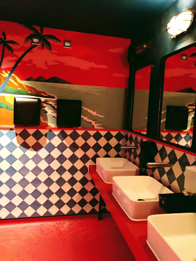 Upstairs are the fun chic shack style toilets. Access via stairs or disabled lift. ( Pace yourself with the drinks if you're seated downstairs) The loos despite the look of the outer metal n wood doors are thoroughly modern , comfortable and private ( see photos) . The whole upper floor has a relaxed island beach vibe befitting the venues name. There's a roof terrace, large booths and l imagine it's a great place for an office party, birthday or anniversary celebration. In fact if you tell them it's your birthday they sing a serenade and bang a kitchen pot to make sure everyone else around you knows too.