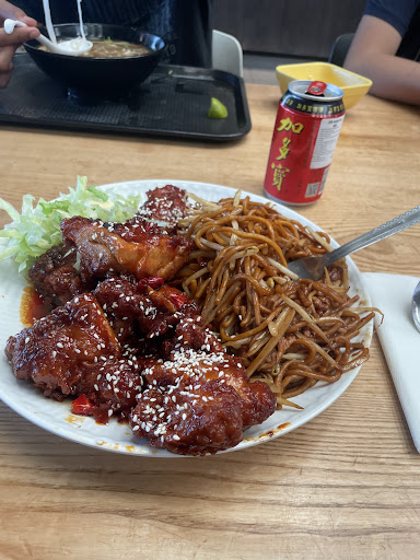 It seems a bit mean to criticise a place for its generous portions but the size of some of these dishes really is obscene. I ordered the dynamite chicken - essentially fried chicken with noodles or rice and salad topped with spicy mayo. It was honestly enough for 3 people and would’ve made a good sharing dish but that’s not clear when you order so we ended up having far too much food. The chicken was ok but a little bit dry. if you had 3 pieces as a side dish it would work but there’s just so much of it, I can’t think why anyone would want to eat so much of the same food. The noodles on the other hand were so dry they were practically inedible. On the plus side, it’s good they give you a pot of the dynamite sauce as well as on top of the dish, as there definitely wouldn’t have been enough otherwise. The honey bbq chicken was a similar story, very dry noodles but in fairness the chicken was much nicer - very tender and moist largely due to the delicious marinade. I think it’s a theme of not just this place but many of the Bang Bang outlets that a bit less quantity and a bit more quality would...