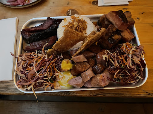 We went for the full monty on our order: the beef cheeks were sliced just right and very tender and tasty, the pork belly was equally tasty and sticky, the rib we shared (there were three of us) fell off the bone, the sausages were meaty, smoky and not at all fatty, and the slaw and bits on the side complimented the meats perfectly. Don't skip the stir fried rice, if it's on the menu. But don't worry if you just get the spiced rice on the side: it was excellent too!