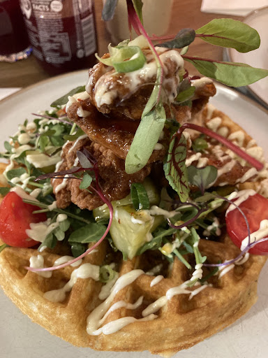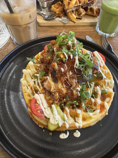 The menu here is a dream for any waffle enthusiast, but two dishes in particular always call my name: the “James and the Giant Peach” and the “Waffln Chickn.” Both are superbly crafted, turning the humble waffle into a star of the meal. The peach dish brings a sweet and savory melody to your palate, while the chicken waffle, crispy and tender, complements the soft waffle with just the right crunch.