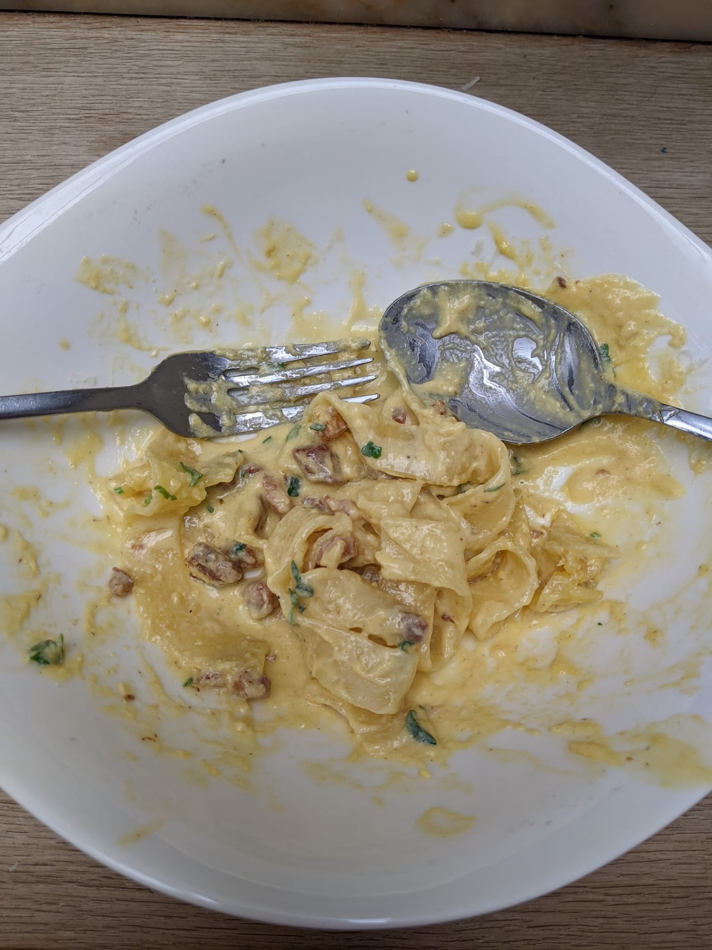 I ordered the Carbonara lunchtime deal, and it arrived in 5-10 minutes. The waiter was jovial and upbeat and arrived with 2 servings of carbonara and my drink. I was pleasantly surprised and shared my confusion, and the waiter was also a little confused but said it must be the lunctime deal. Was this a token of apology for my bad app experience? Good karma? The waiter said it must be my lucky day, and so I happily grated paramesan cheese on both plates and got stuck in!