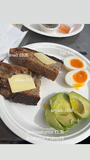 I ordered the eggs on toast with avocado, but what I got was a laugh. The dish consisted of a single boiled egg, half an avocado, and a few tiny pieces of cheese. I think the pictures speaks for itself. This came on a plastic plate and was priced for a good ÂŁ8. It felt like an overpriced, underwhelming meal, considering the actual cost of the ingredients was likely less than ÂŁ1.50.