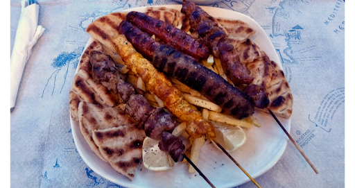 Going inside you can see a bright glass deck  full of fresh salads, sauce, xaxiqi, spicy chees and a lot of homemade cooked food. Two big gyros ( chicken and pork freshly made )spinning slowly,kokorec in suvla , mix meet in the grill and sausages (lukaniko- made by the chef with fresh meat vegetables )hanging for drying ,kalamaki, sqepasti, and grilled sea bass.
