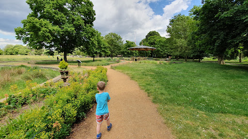 nice park, especially summer time, have big ground generally used for cricket sport, small stream of wandle river passes through the park and do give good experience as there are lot of sitting benches available next to the small pond. best place for kids, lots of sports activities available. parking facility for around 10-15 cards. i am sure its first come first serve basis. cafe inside the park serves hot and cold food/drink. toilet facility available at cafe. there is a band stand available for any local artist to perform. basketball, tennis, skates separate courts available.