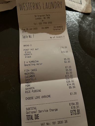 We ran out of bread as you only get 2 teeny post-modernistically sliced slices for 2 people and I reminded them 3 times to bring me some more. When they did it was 2 of the end pieces of the loaf... Considering they take bookings way in advance you would have thought they could resource properly - sadly not, ordering time was long and the waiting staff were rushing around with little attention given. The wait between dishes was around 30-40mins. This ones a personal opinion , but if I’m going to go to a restaurant charging £50-60 a head and wine that starts at £30 a bottle you would expect a better atmosphere. Sadly I was surrounded by obnoxiously loud hipsters having a shouting competition. No plate change until requested, despite the plates sodden from the starter. Again refer to above price, you would expect a plate change. We ordered the lambs heart hummus chermoula - essentially a plate of offal in hummus without anything to dip - perhaps I’m not refined enough to enjoy this dish. For me it was just swimming with oil and crying out for something carby to go with it. I then paid £22.50 for a half portion of sea bass smaller than a child’s bowl of cereal - in fairness it was very fresh but I felt like a starter rather than a main. I donate regularly to my own charity but the fact they put a stealth £1 streetSMART default charity into the bill was unprofessional.