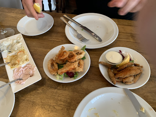 The Meze is great value and the portions are generous. Pictured starters : pita Bread with Olives, Spicy Sausage and Calamari, Mains ; Kleftiko with Roast Potatoes, Hake and a Side Salad.
