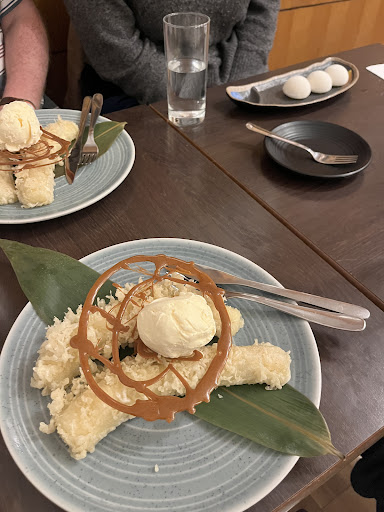 Small but perfectly formed Japanese place tucked away on Crouch Hill. Has been around for a while and they serve excellent food for reasonable prices. We shared starters so I had the pleasure of trying the deep fried squid, gyoza and a crab salad. All were good, although perhaps a little small. As a main I had the sirloin chilli steak, which came in a slightly curried spicy sauce accompanied by fried veg. Disappointingly it was cooked near well done, despite me requesting medium rare. Also the veg was lukewarm at best- but neither of these issues took away from what was a pretty damn good dish. Quite a unique preparation and a nice change from the standard katsu/teriyaki options of most Japanese restaurants in London. The meat was very good indeed, very lean and succulent. For desert I had green tea ice cream which was nice but not very exciting, although I poached a bit of the banana tempura from an adjacent plate and was impressed. All in all a decent nosh that I would definitely come back to...