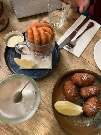 As soon as we opened the menu it became clear that sticking to just oysters would be impossible. A wide selection of seafood called out to us, and we just couldn’t resist. We ordered a 1/2 pint of Atlantic prawns alongside a trio of salt cod and crab croquettes (adding an extra one for good measure) alongside our first round of 8 oysters.