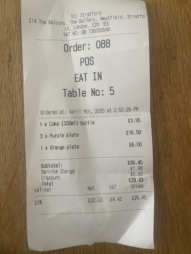 Our order ended up being rather pricey at a bit over £60 for the three of us and we were still hungry after that unsatisfying experience. Sushi isn't a particularly cheap type of food but to end up still being unsatisfied after lunch was disappointing. My friend and I even went elsewhere on a different day to 'eat away' the disappointing Yo Sushi experience.