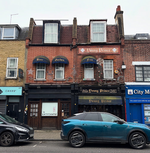 The Young Prince is located halfway down Roman Road in Bow in the East End of London. The nearest Tube is Mile End.