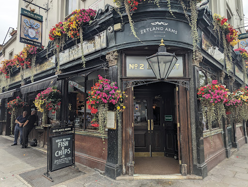 The Zetland Arms is (now) a Greene King pub close to South Kensington Underground station. I've known this pub for 15 years now; once it was (AFAICT) an independent pub, then a Taylor-Walker, now it's a Greene King. The selection of real ales is small (three, but not all three will be available at all times), of course you can get any kind of alcoholic and non-alcoholic beverages there, too. It's a pub steeped in history - it was once owned by Sidney Chaplin, Charlie's brother. The history is in fact more interesting than the present. Speaking of the present, it's a fairly solid traditional pub, popular with locals and tourists alike - on weekends and weekday nights it's always packed. The food is, well, streamlined, as it is at other "chain pubs" (Wetherspoon, Nicholson's etc). Drinks in the glass are allowed outside, which is a plus - and eminently necessary during peak hours. Beer prices are inflated though- but they are everywhere else in this neighbourhood, too. An alternative on offer is The Angelsea Arms, a 5-6 minute walk from this place (and farther thus from the station), which offers nice outside seating and more atmosphere.