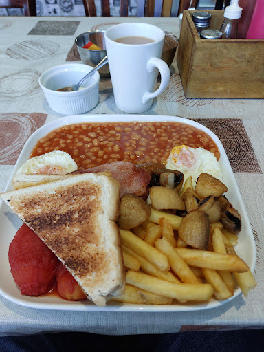 Reminds me of Tom Brown's in Benidorm. The food is awful. The chips look like they've been quadrouple fried (or from leftovers) The English breakfast is one of the worst I've been served. I don't get why many cafes decide to ruin a breakfast with those cheap long brown chip shop sausages (not even pork). If they stepped up the game and bought better ingredients then they might just see the benefit of better custom (try adding a Cumberland to the dish instead of that horridness) I'm guessing the owners don't want to pay the extra for any sort of quality which is understandable.