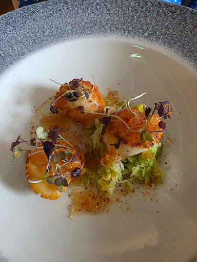We choose prawns in red Thai curry sauce and scallops without the hammock croquette as I don't eat meat. We then had confit shoulder of lamb and stonebass, and we managed to find room for a vanilla parfait and a chocolate delice. Only one coffee as they unfortunately don't do decaffeinated. The Kent white wine was delicious and the cider had a good balance to it. We look forward to...