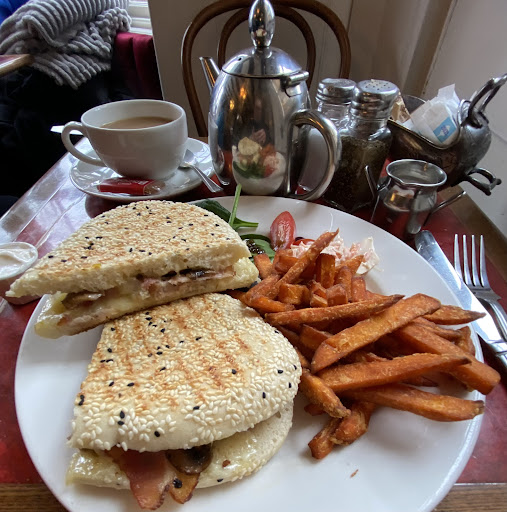 Really disappointed by our visit, we arrived and were seated (waitress pointed to the table across the room) and waited around around 30 minutes, expecting someone to come over to take our drinks order. When no one arrived, my partner had to go up and asked a waitress if we could make our order and she said she'd be with us soon. Around 15 minutes passed and the same waitress we asked to take our order wandered aimlessly around the room, scanning the room a few times but ignoring us and not coming to take our order. We found the staff completely unattentive and finally had our order taken by a waiter who came to clear the table next to us. Drinks arrived and the iced coffee and milkshake were lovely but we had finished our drinks long before our food came and we were looked straight through when trying to get their attention for more, they just walked away. The food arrived just shy of an hour after we arrived and we only ordered 2 paninis, a baguette and some chips. On arrival we were offered sauces, we asked for mayo and it never arrived but the table next to us did! Really disappointing as the food was good, but we won't be back. It was pricy for what it was, and we had planned to order 3 slices of cake to take away but the service was honestly so bad that I didn't want to give them anymore of my money....