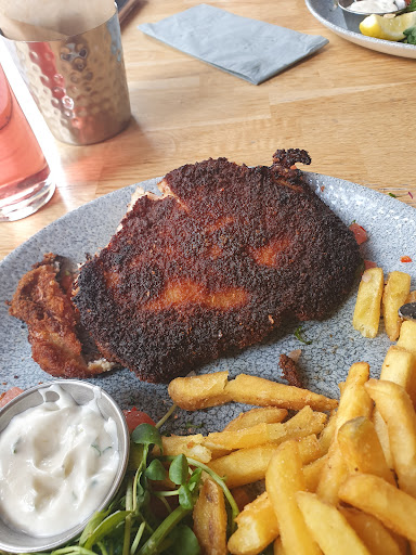 Though half of our groupâs mains arrived in reasonable time, the rest didnât come until long after we had finished. Two of us ordered the Alpine Chicken Schnitzel: this was bland and not overly filling, and came with a wilted, droopy salad.
