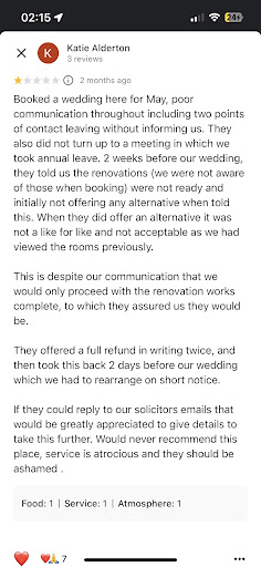 Read moreAs per usual once again after contacting PM and promising the owner would contact again nothing. I expect my deposit by no later than 12pm on Monday 7th Feb via cash or Bacs otherwise I will be proceeding with legal action, small claims court to get my 650 deposit back and reporting this company to the authorities as you are not accommodating and I want is my money back. I would rather go to a venue who responds within a few days and not weeks it's not good enough. Do not respond to emails or contact you in four weeks. They owe me 650 for a deposit for venue hire during covid. They was not accomodationg and used that as a clause to get out of paying my deposit back. I have spoken with other venues and my business advisor and now I am aware that this is not great practice and I am entitled to my deposit back. If I do not get a response by 12pm today I will be taking it to the small claims Court and reporting to trading standards about this poor service to consumers.