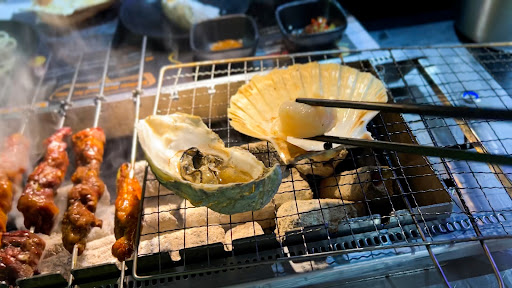 The concept is quite simple if you're eating the BBQ - They fill a grill in the centre of your table with charcoal and then you're free to pick skewers containing meat, seafood and vegetables to cook at the table! Some food cooks better than others but make sure to place the skewers on the grill properly so they self-turn. Otherwise you run the risk of burning one side of the food.
