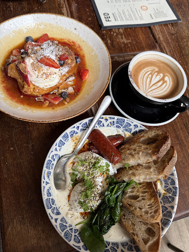Read moreWanted to try Federal for ages and we ended up trying the Deansgate cafe on their 6th year anniversary(!) and honestly, lived up to the hype. The staff are so aware of who joins the queue outside, came straight out to greet everyone, hand out menus and update on wait times. When we got seated (there were 5 of us) after 15 mins of waiting - not a complaint, just adding to make people aware of how popular this place is and it didn’t feel long at all - we could order straight away because we had the menu the whole time. Ordering online is super easy and signing up to their loyalty/reward scheme was too and it’s going to be worth it as I’ll defo be coming back. We got the Turkish eggs, French toast (pictured), avo and smoked salmon on toast and eggs benny with multiple coffees. 12/10 experience. Servers were so nice, food and coffee was excellent and the ordering system was so good you could tweak your orders to exactly how you wanted - which isn’t normally possible on online ordering systems, big plus!!!! I personally love Deansgate anyway so location to me is spot on but I’ll be sure to go to their other cafes as well to complete the set. And the toilet was clean and smelt lovely !