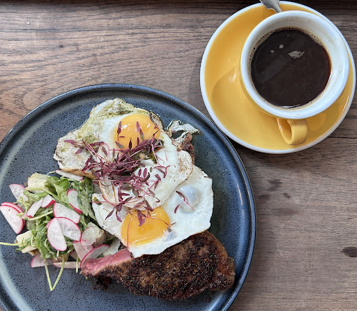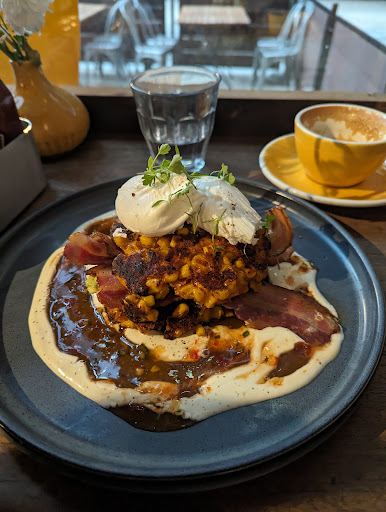 I've walked past a few times and wanted to try but always put off by the queue. Finally bit the bullet and joined the queue on a Sunday at 1pm, waited about 25 minutes. We were given menus and told it would be about 25-30 minutes so we knew what we were signing up for. The space inside isn't very big at all, and they pack alot of tables into a very small space, it's very tight and there's really not much room, I wouldn't recommend buggies or anyone with mobility issues. Me and my friend were seated on a small bench at the window, there was just enough space. Can't complain about the food and coffee, drinks arrived very quickly and the coffee was delicious. I had the sweetcorn fritters with bacon, I've never seen anything like this before and was curious, it was very tasty, and good portion size, although maybe a bit expensive at £14. Staff were very friendly and welcoming They add a 10% service charge even though nobody takes your order, you order on your phone or at the till, seems a bit cheeky. You can remove it though. Overall a nice visit but I wouldn't rush back to queue up, if I happened to walk past and there wasn't a queue then maybe but there are plenty of other places that are just as good that you don't...