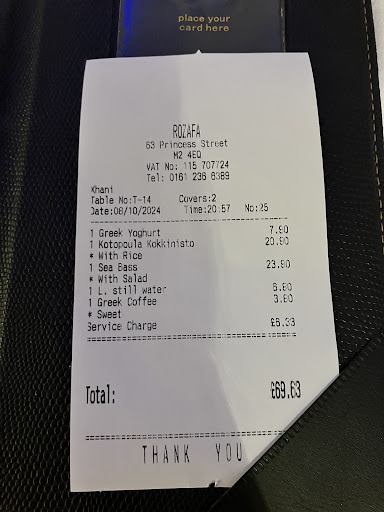 Lastly, the menu online seems outdated. The one in the restaurant was a bit more expensive, as you can see the kotopoula kokkinisto cost £20.90 on my receipt and the menu, but online it says £18.90! How is this possible? Please update the menu because I actually spent more than expected.